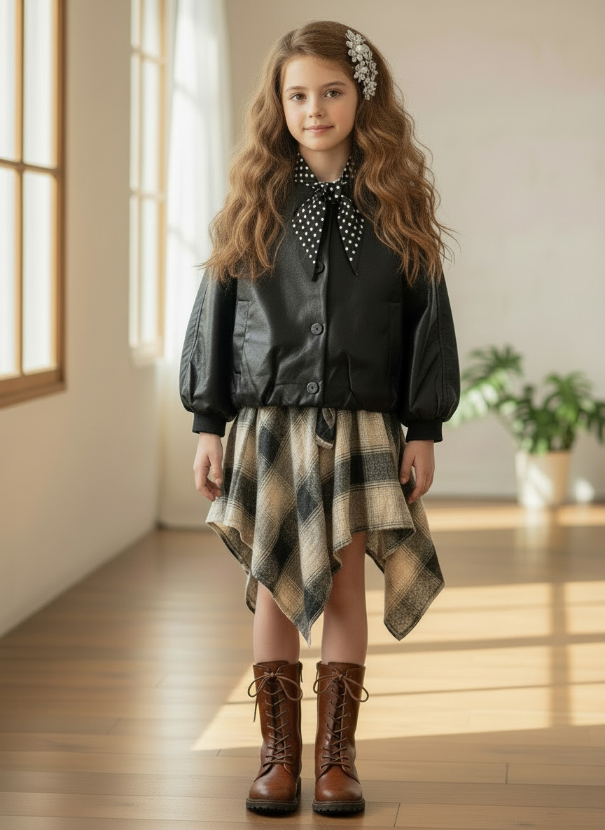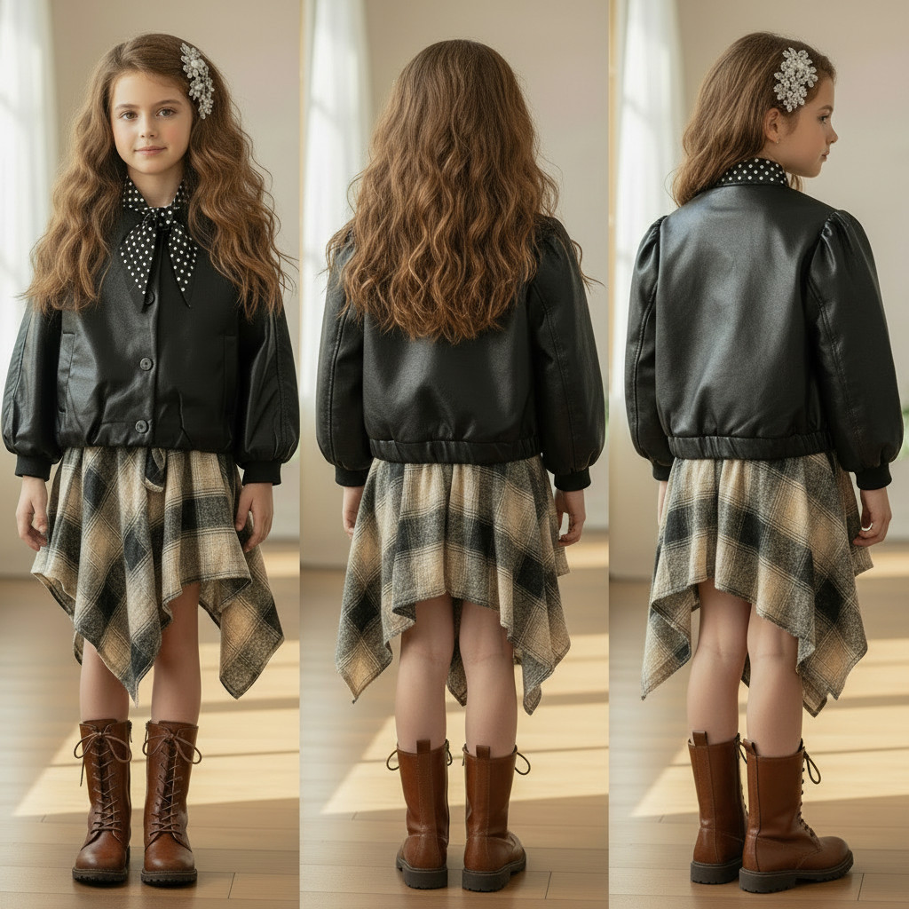 這件皮衣是為追求個性的時尚媽咪們準備的單品。它巧妙地將經典的機車皮衣元素與甜美的波點絲巾結合,打造出今年秋冬最流行的「帥氣甜心」風格,讓您的寶貝在人群中脫穎而出!
