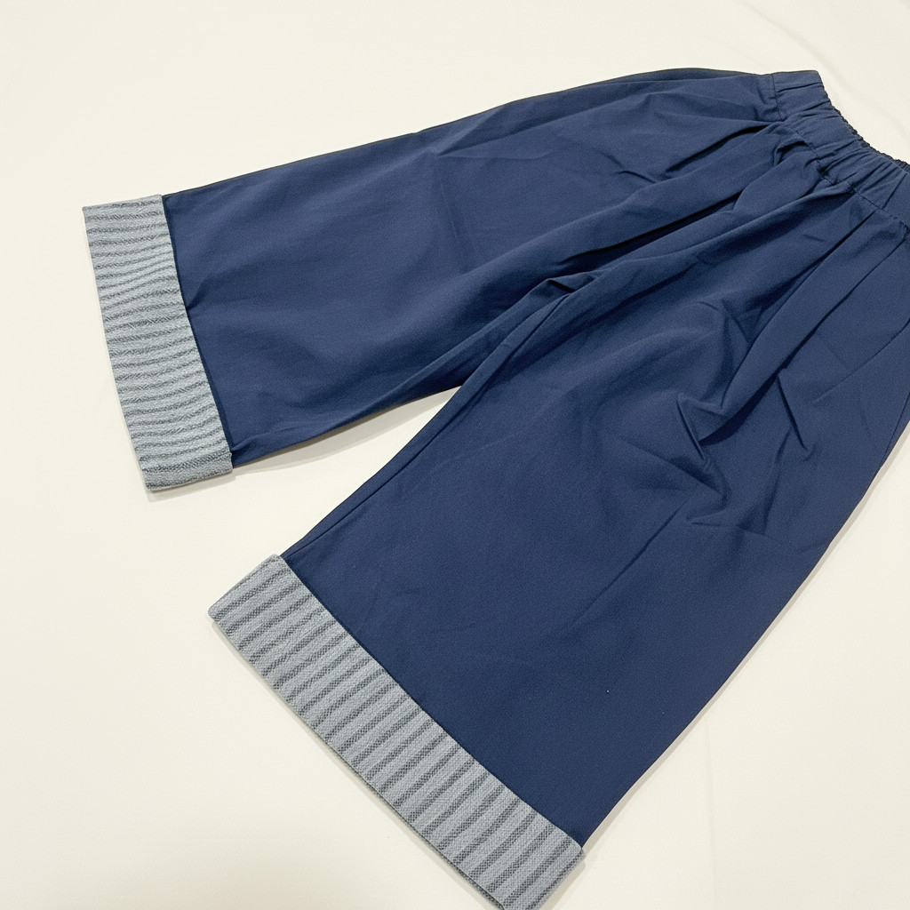 獨特條紋反摺: 褲腳做了反摺設計,露出內層的條紋布料,讓深色褲子多了份層次感和時尚度。反摺的設計也讓褲子的長度更具彈性。