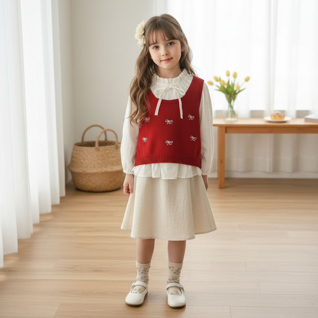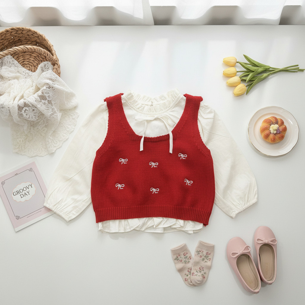 【商品規格】白色荷葉領長袖上衣 x1 + 紅色蝴蝶結刺繡針織背心 x1 (兩件套)