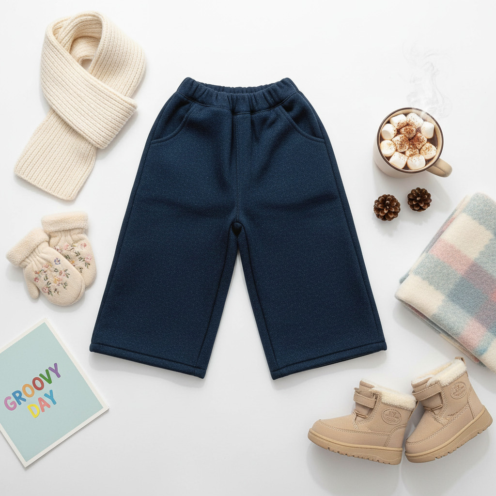 【HokkyDot】台灣現貨|A83|兒童寬褲|藏青內刷毛長褲|寶寶加厚長褲|120